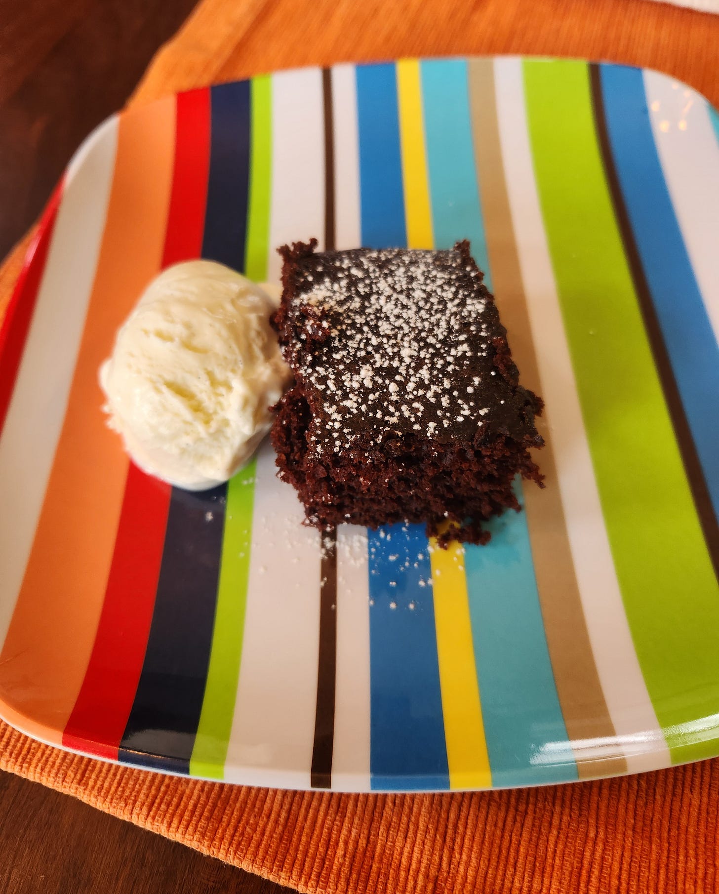 Bake for 25-30 minutes in a 350° oven. Serve warm with ice cream or cool completely and either frost or top with powdered sugar (and maybe still serve with ice cream!)
