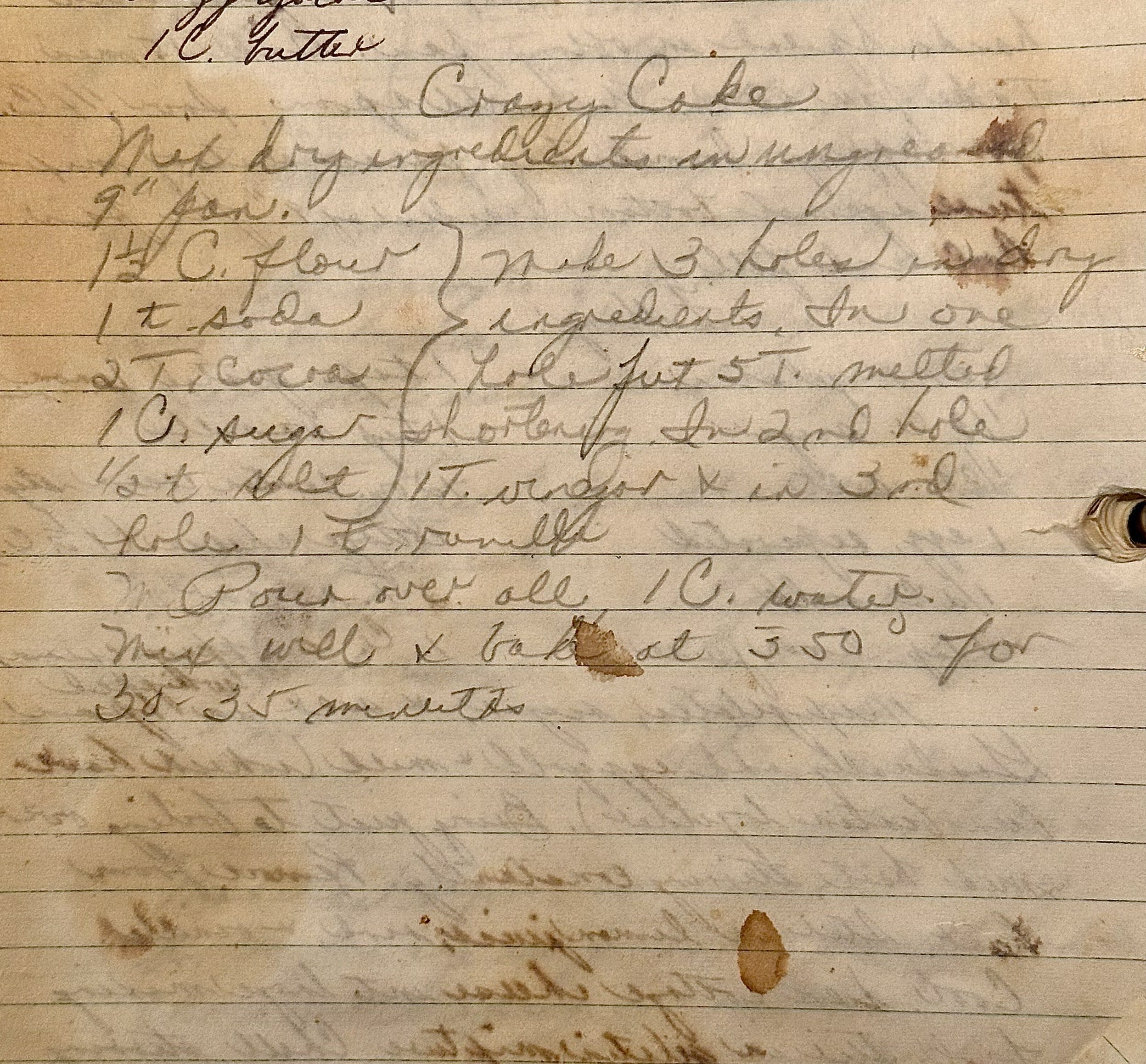 Mary’s mom would have been 100 years old this past May, so one of the ways Mary honored her was to spend time going through some favorite family recipes. She found this one for Crazy Cake in Pat’s personal handwritten cookbook. Written in pencil. While searching through those old recipes, Mary noticed that most of them were written in pencil. And, as she and I talked about that, we started wondering why so many recipes from the past were written that way. (A story I published earlier about another old cake recipe, Chocolate Mayonnaise Cake, was also written in pencil.) Maybe it was easier to find a pencil instead of a pen, or maybe it was easier to make changes and notations to the recipe if a pencil were used. I don’t know, but I really am curious about that. Just thinking out loud here: I make changes to almost every recipe I make. Maybe I should start using a pencil instead of an ink pen and white-out. Although ink does last longer. Hmmm…a dilemma.