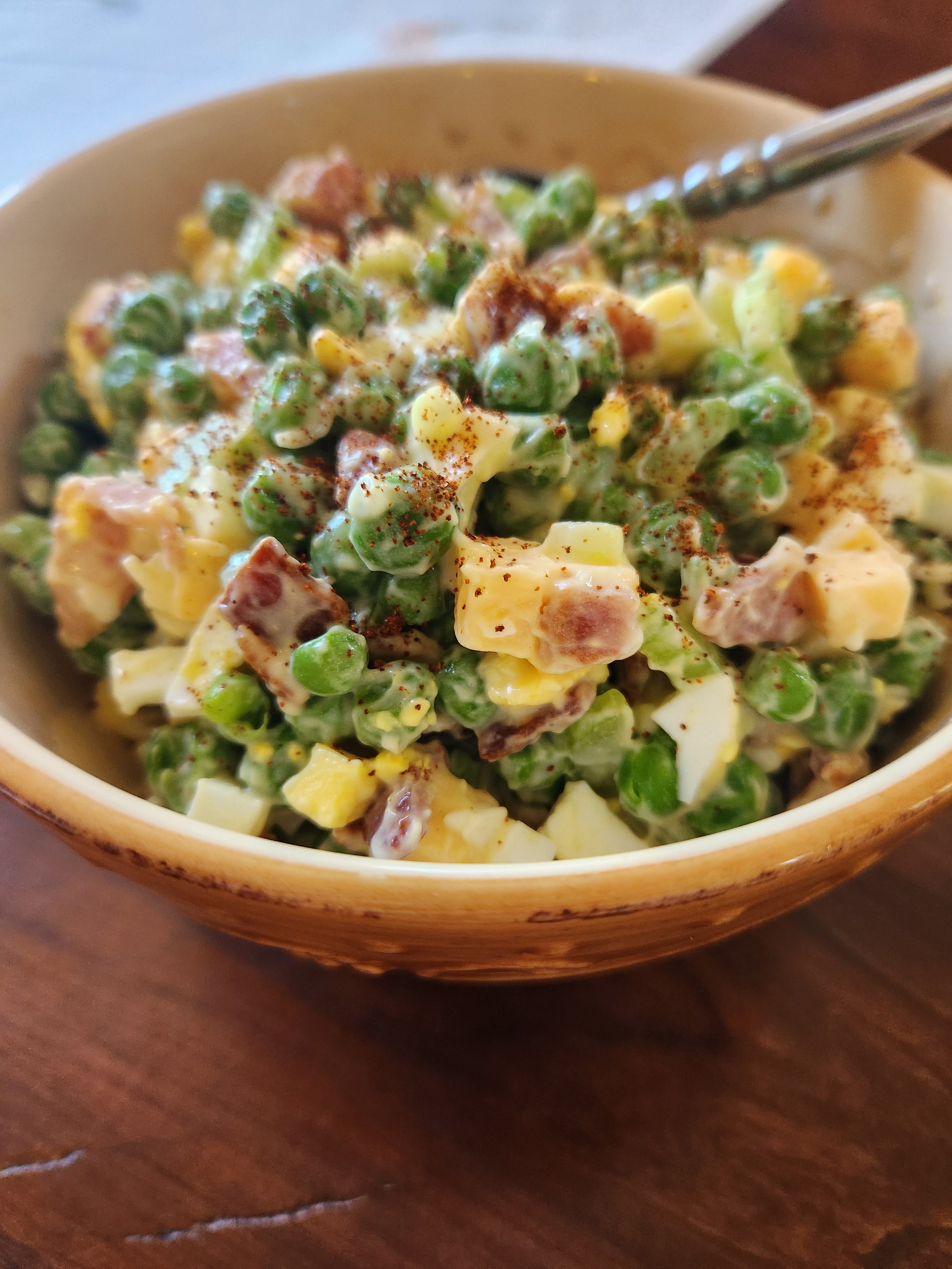 To bacon or not to bacon? That is the question in our house. When one first meets their spouse-to-be doesn’t the conversation eventually turn to pea salad? For some reason, it did for us. And during this exchange my husband told me that he used to make the BEST pea salad. Ummmmm…. Excuse me. I make the BEST pea salad. Why this discussion occurred is beyond me, but at the time it was a thing. Maybe before one considers the commitment of marriage, there should be a mandatory talk about how one prefers their pea salad.
